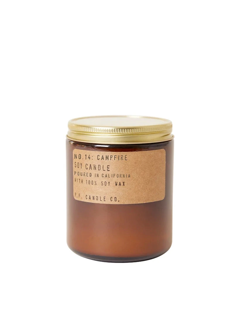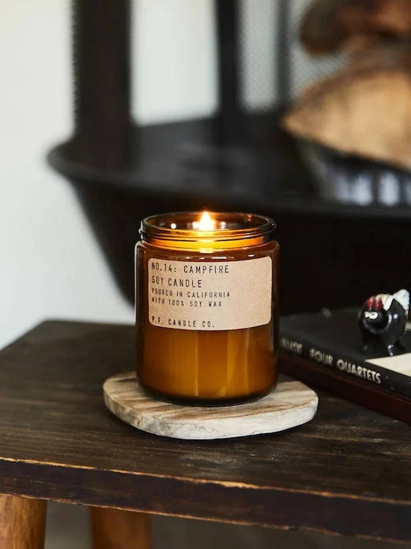 PF Candle Co. Standard Candles are hand-poured into apothecary inspired amber jars with our signature kraft label and a brass lid. This is our most popular size and is meant for dressers, countertops, nightstands – basically everywhere.